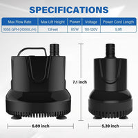 Specifications: Dimensions: 6.89*5.39*7.1inch; max flow rate: 1056GPH (4000 L/H); max lift height: up to 13 feet; 85W; 110-120V/60HZ.