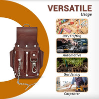 MATERIAL: This dark brown leather electrical tool pouch made with Leather .Includes a handy metal tool clip. Washer rivets provide extra strength. Chain on the front of electrical tool pouch holds electrical tape and is easy to reach.
