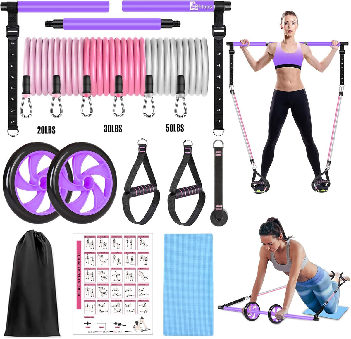 【BBTOPS Perfect Pilates Bar Set】Our portable pilates bar kit includes 3 sections of high quality steel pipes, 6 resistance bands, 2 abdominal wheels, 2 handles, 1 door anchor, 1 portable bag, 1 training guide, 1 Mat, If you have any questions about quality or use method, please contact us promptly and we will get back to you within 24 hours.
