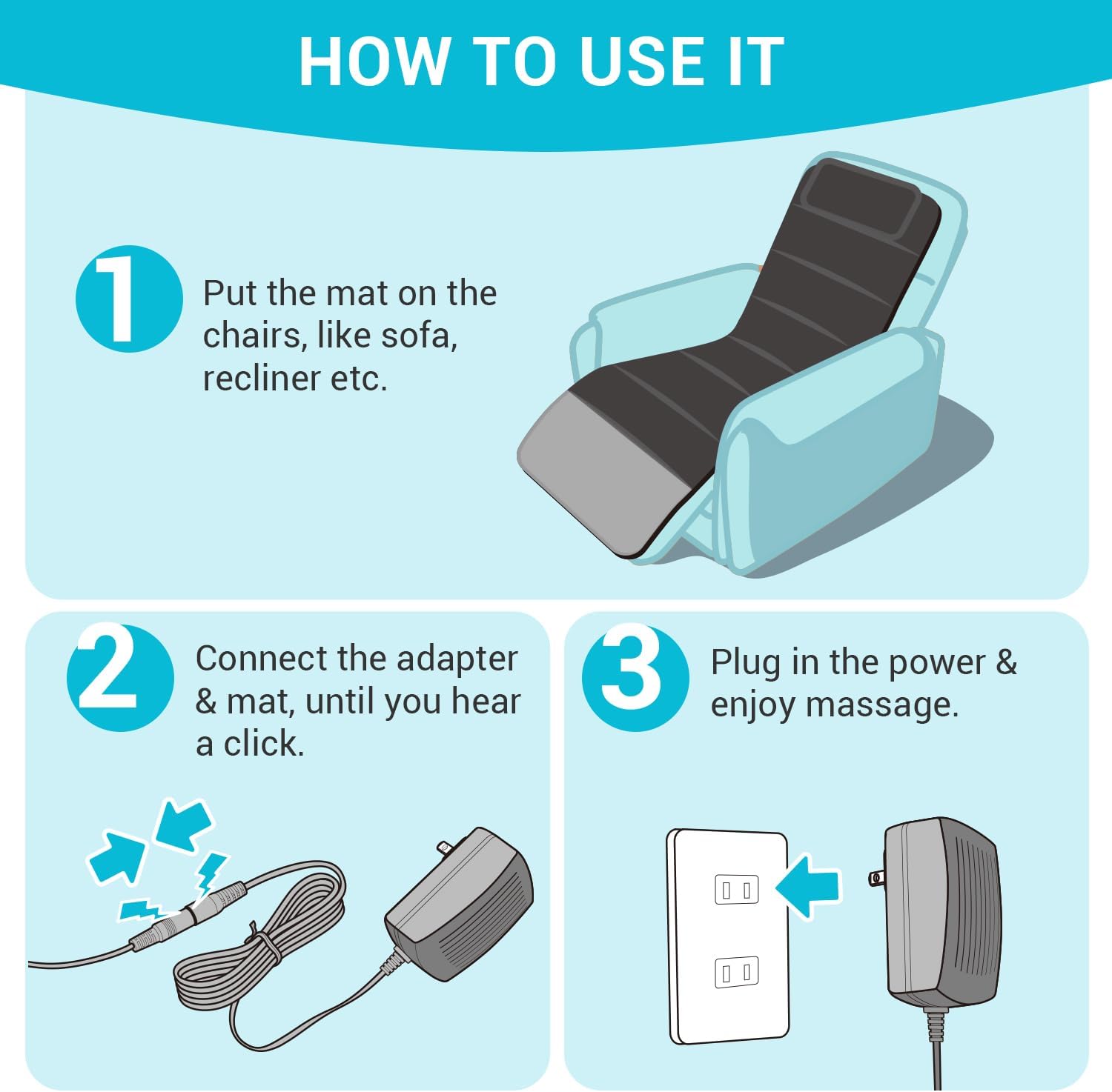 How Five Vibration Programs Work: Five vibration programs target specific areas on the upper, lower back, thighs and legs. You can program the massage mat only to massage the upper back, the lower back, or the legs. You can also combine two or all three of the areas for the massager to work on at a time. With variable vibration settings and adjustable intensity levels, you can customize a relaxing massage session to your preferences.