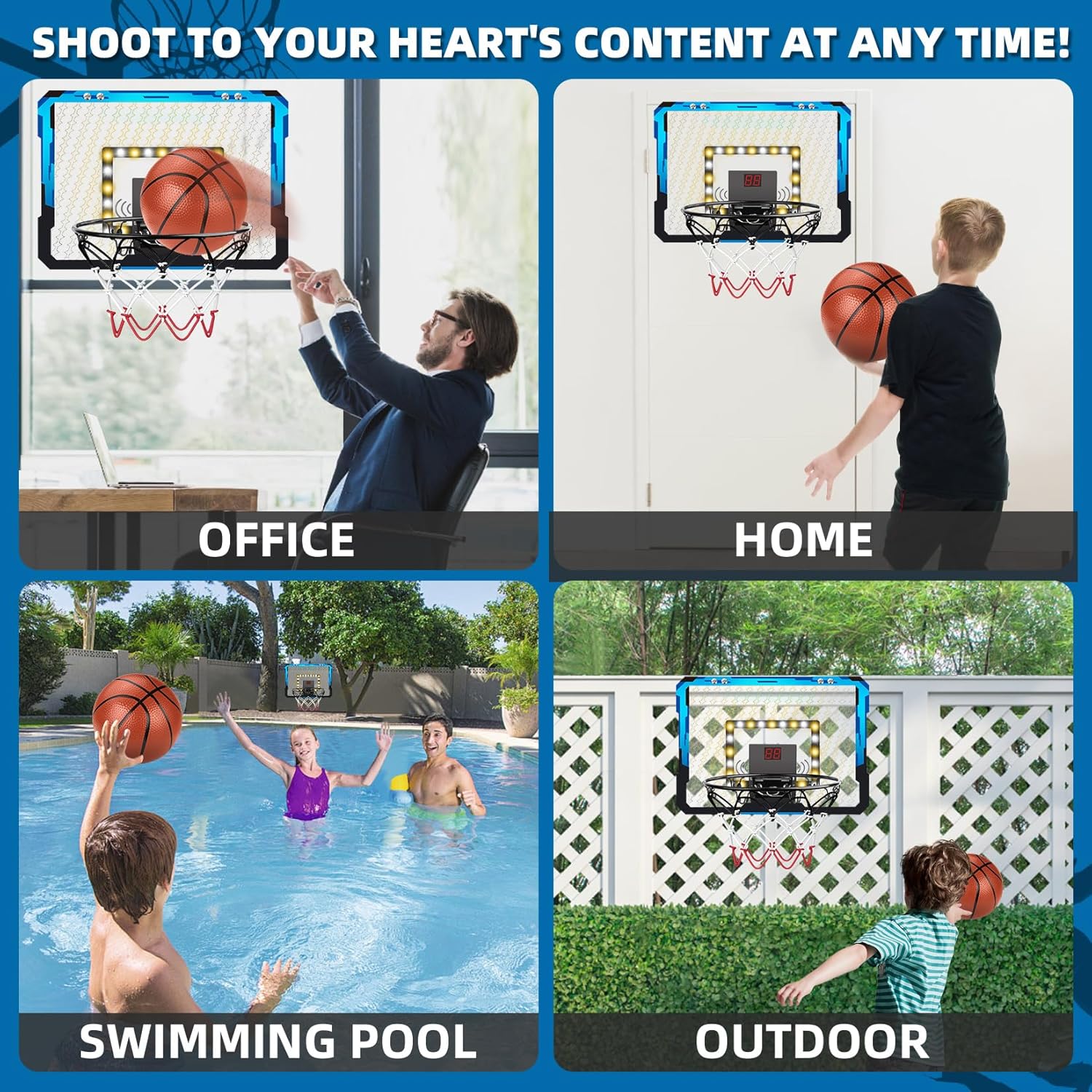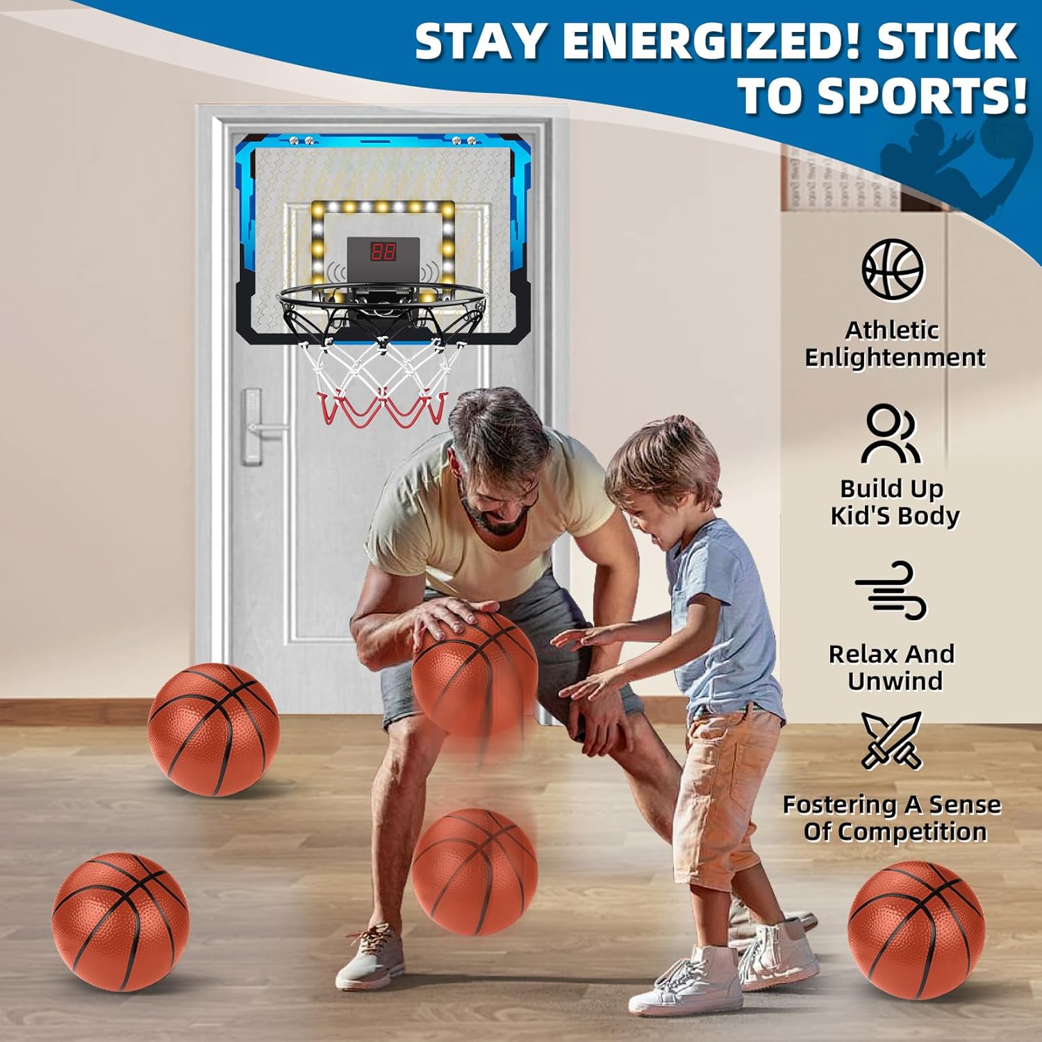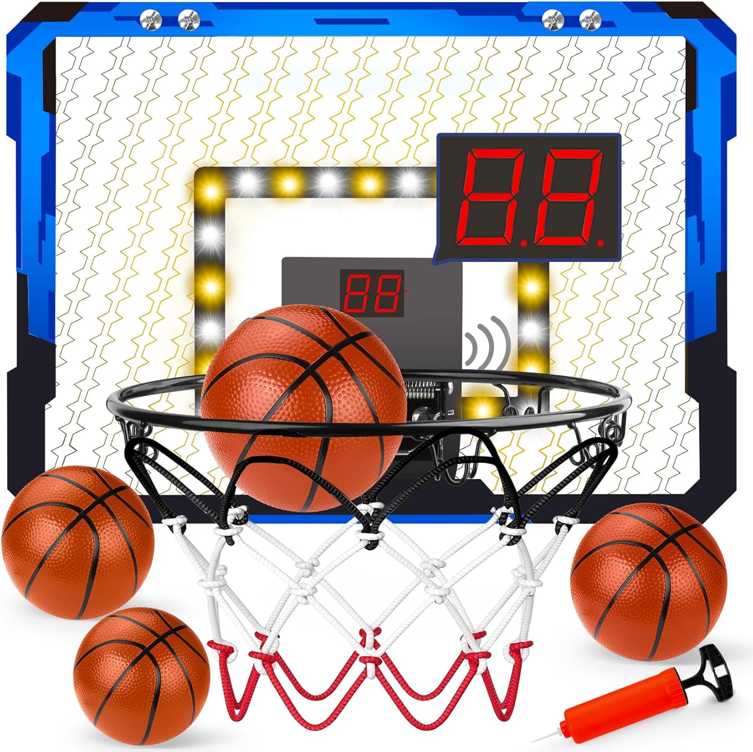 🏀[MINI BASKETBALL HOOP SET WITH ELECTRONIC SCOREBOARD] -- Hapystar Mini Basketball Hoop Set includes 1*electronic scoreboard, 4*16cm basketballs, 1*pump, 1*detailed instruction manual and 1*tool kit set. Cool LED lights make your dunks more visually appealing, so your kids and you can experience the dunking game at home! Wall basketball hoop can not only bring joy to kids, but also good game for adults to relax in their daily work.