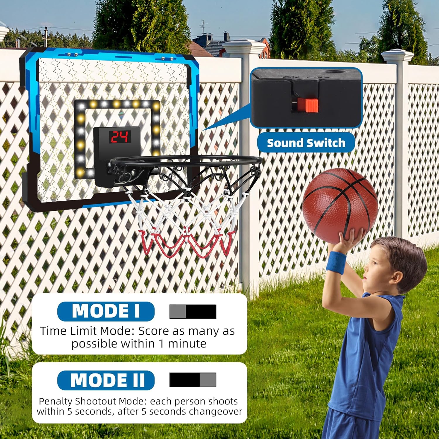 🤾🏽♂️[Realistic Dunking Experience] -- Experience the thrill of dunking like a pro! Mini goal basketball hoop with spring mechanism allows you to recreate the thrill of dunking. The high-quality steel rim ensures that the mini basketball hoop can withstand the mightiest dunks without bending or breaking. Kid indoor basketball hoop with go-in sound effect and lights ignite your child's passion for sports while promoting the development of motor skills, visual tracking and hand-eye coordination.